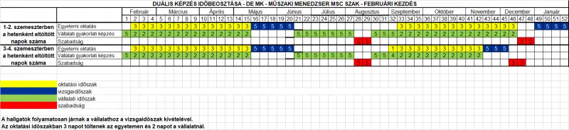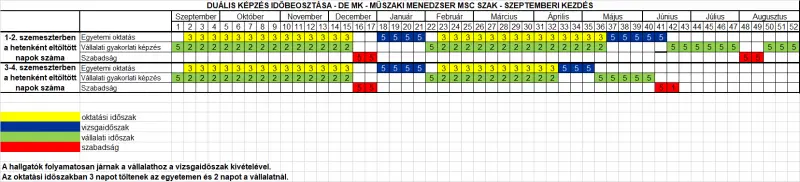 A képzés duális jellege abból adódik, hogy a gyakorlati oktatás a Debreceni Egyetem Műszaki Karán kívül – a képzési idő felében – Partnervállalatainknál történik. A duális hallgató a szorgalmi időszakot a „hagyományos” nappali munkarendű hallgatóval együtt végzi a felsőoktatási intézménynél (intézményi szakasz). A szorgalmi időszak alatt, heti két napot tölt a hallgató a partnervállalatnál. A hallgatók a tanulmányok ideje alatt hallgatói munkavállalói státuszban vannak, és fizetést kapnak.